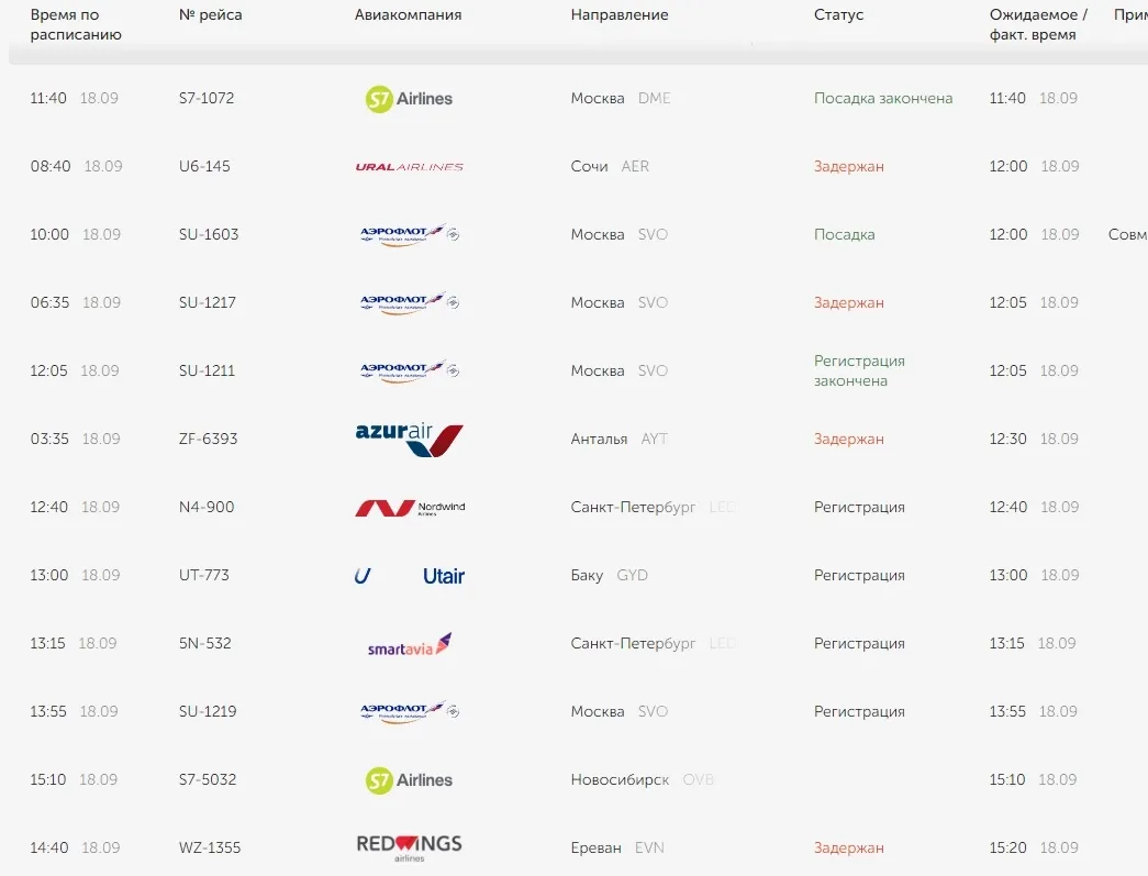 По данным открытого расписания на сайте аэропорта, сейчас задерживаются рейсы в Сочи, Москву, Анталью и Ереван.