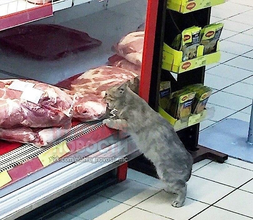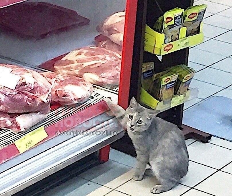 Фото "с места событий" появились в сети. В комментариях пользователи пошутили над тем, что это просто новый сотрудник магазина - дегустатор. Многие подчеркнули, что если кот ест мясо, значит, оно свежее, надо брать.