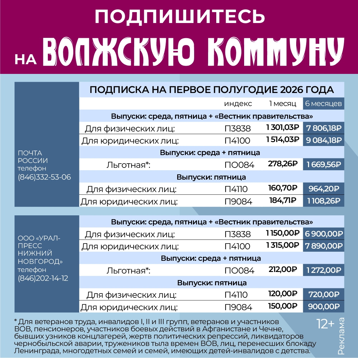 Оформить подписку на газету "Волжская коммуна" вы можете в отделениях "Почты России" и "Урал-Пресс Поволжье" или по указанным номерам телефонов.