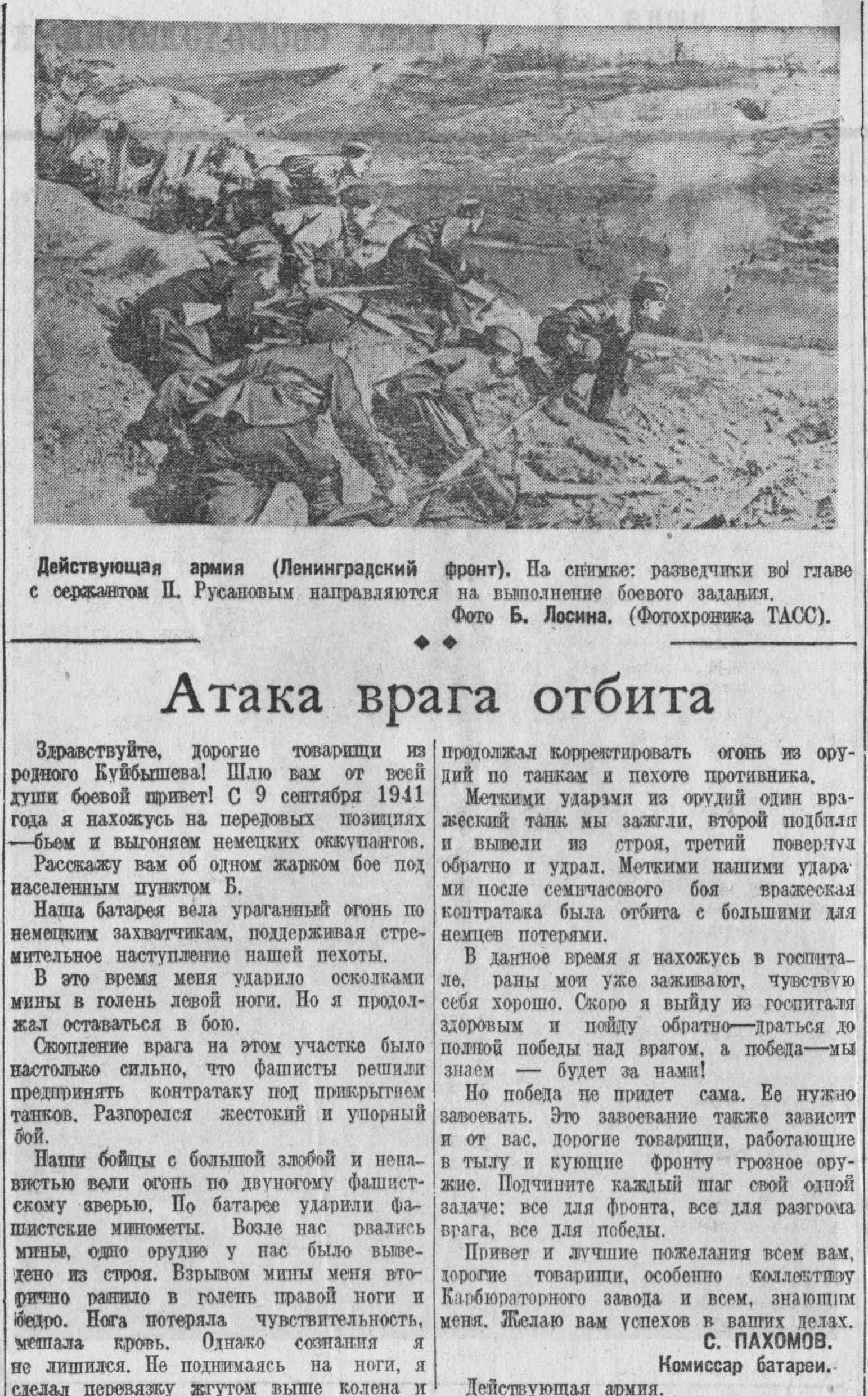 Куйбышевцы на фронте показывают высокие образцы мужества и храбрости. Часть, в которой служат в основном наши земляки, одержала немало замечательных побед, ей дважды салютовала Москва. За освобождение города Брянска часть получила почетное наименование «Брянской», а за освобождение другого города она награждена орденом Красного Знамени. За доблесть и мужество, проявленные в боях многие куйбышевцы удостоены высоких правительственных наград. Среди них — старший сержант Чередник. Отважный сапер ночью, под сильным огнем противника проделал проходы для танков и пехота, а утром сам, один из первых, ворвался в немецкую траншею и яростно уничтожал фрицев штыком и прикладом. За этот подвиг т. Чередник первым в части награжден орденом Славы.