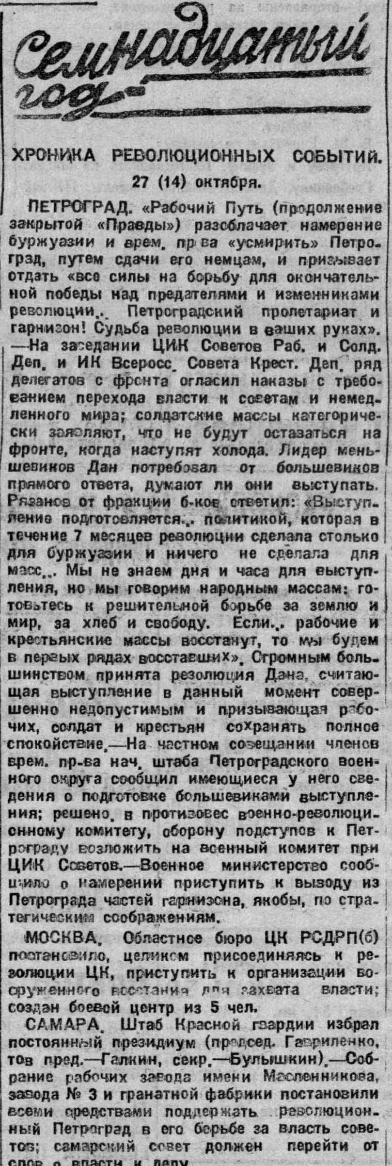 ...Освежающим ураганом проносилось по просторам Поволжья, сметая царских воевод, крестьянское восстание, поднятое легендарным Степаном Разиным. А с какой готовностью сдавались волжские города и крепости Емельяну Пугачеву. Поволжье во вторую половину прошлого века походило на огнедышащий вулкан: пылали помещичьи усадьбы, вспыхивали бунты, делилось барское добро. Революционное и боевое прошлое народа — это наше сокровище, наш бесценный капитал. Вот почему «Волжская коммуна» обращается накануне 50-летия Советской власти к своим читателям: «Давайте вместе пройдем по местам революционных событий, восстановим в памяти народной имена водителей и слуг народа, которые пока еще остаются в тени, расскажем о наиболее героических страницах борьбы за социалистическое Отечество».