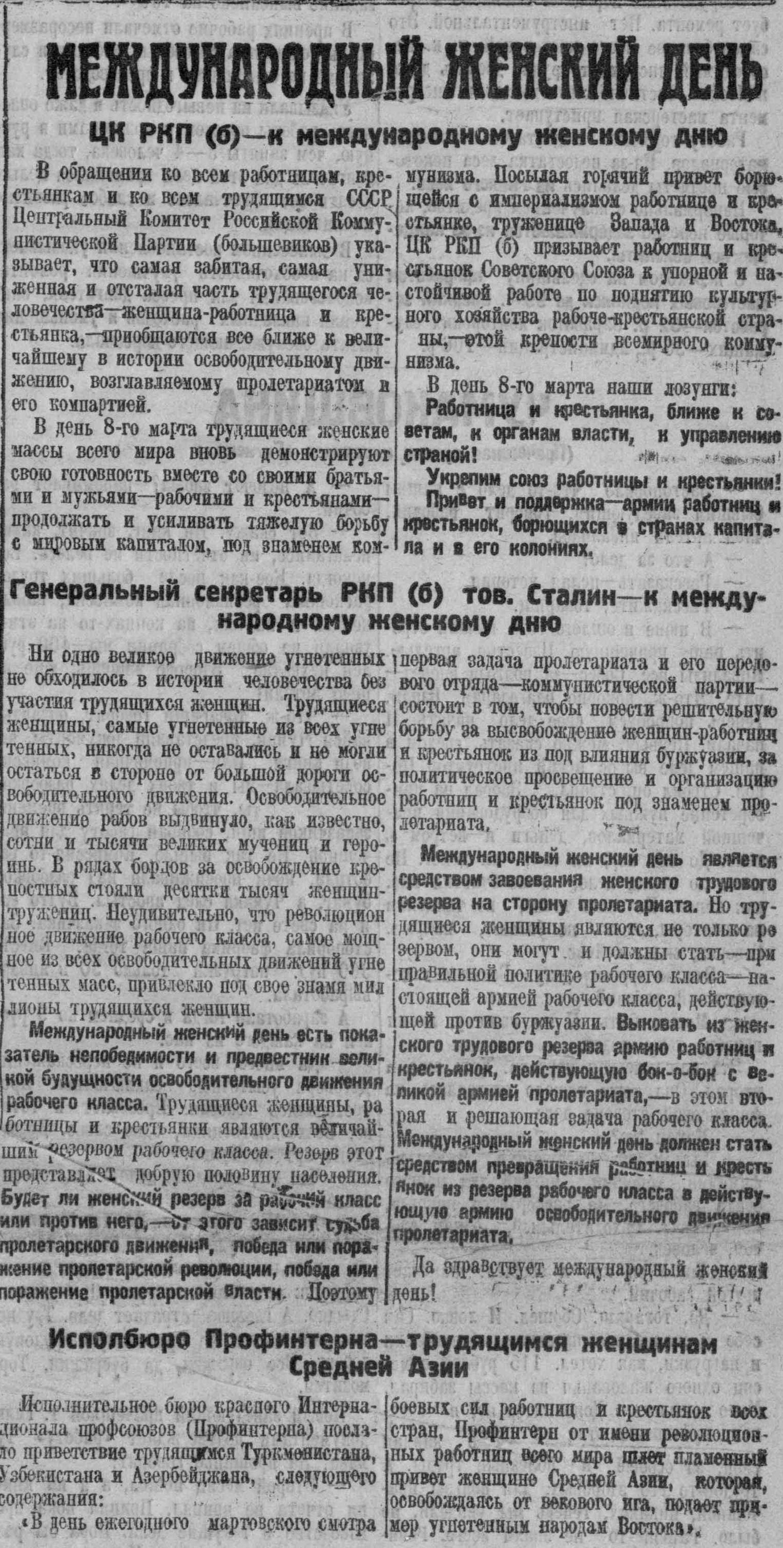 Всесоюзный Центральный Совет профессиональных союзов постановляет — поддержать инициативу работниц и женщин-служащих и установить, что 8 марта работа женщин в предприятиях и учреждениях должна производиться полный рабочий день...