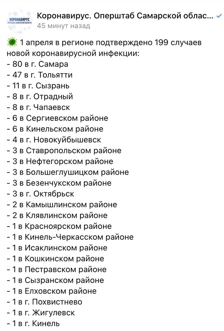 1 апреля в Самарской области COVID-19 обнаружили еще у 199 человек