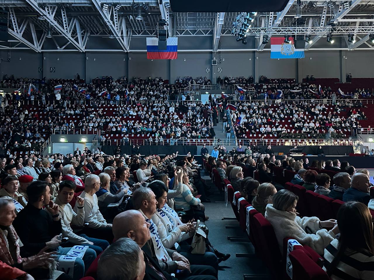 К началу "Русской весны" почти все места во Дворце спорта имени Высоцкого были заполнены. Здесь собрались жители и гости губернии разных возрастов с флагами России и патриотической атрибутикой.