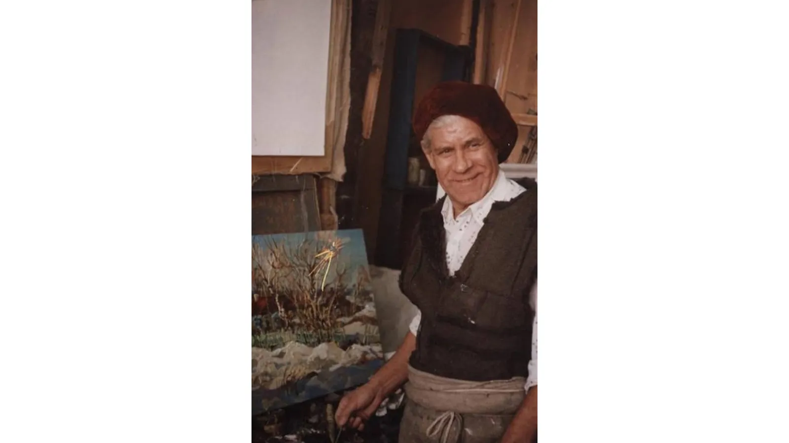 С картинами и этюдами соседствовали заляпанная красками табуретка, старые чемоданы, тряпочки, вырезки из журналов. На стене - лосиные рога. Их очертания видны у некоторых сказочных персонажей мастера.