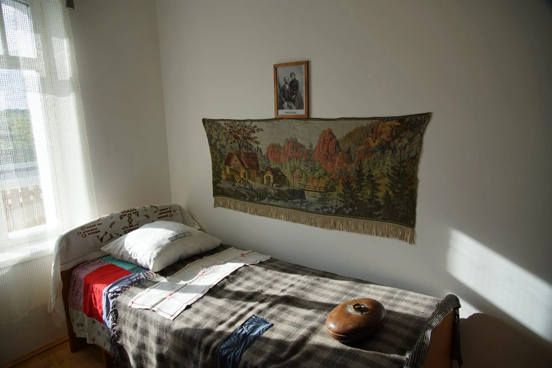 В соседней комнате - спальня супругов с трюмо, которому около 150 лет, старинной кроватью и комодом, где расставлены флаконы с духами и ларец с бусами. Здесь же - шляпки, бархатное платье и даже свадебный наряд с расшитыми туфельками.
