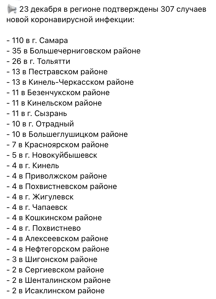 Сегодня, 23 декабря, стало известно, что в Самарской области опасную инфекцию выявили ещё у 307 человек. Информацию передал федеральный оперативный штаб по борьбе с коронавирусом.