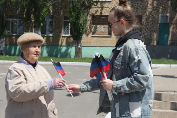 Также местное отделение общественного движения "Донецкая Республика" и общественная организация "Молодая Республика" в Тельмановском районе провели акцию "Три цвета гордости и славы". Жителям вручали флажки-триколоры.