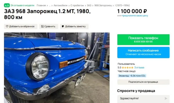 При этом транспортный налог на "Запорожец" составит всего 100 рублей в год, ведь машина имеет мотор на 1,2 литра мощностью в 40 л. с. Кроме того, на сайте указано, что у авто 1 владелец по ПТС и в ДТП малолитражка не была.