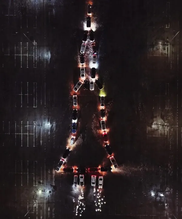 Так, активисты на парковке одного из торговых центров выстроили инсталляцию из автомобилей в форме ракеты.