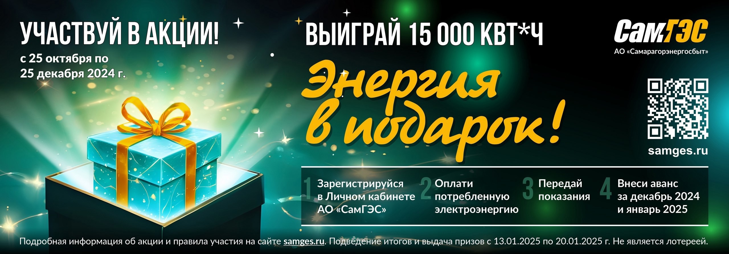 40 пользователей личного кабинета получат в подарок от гарантирующего поставщика АО "СамГЭС" 200, 400 или 600 кВт*ч электроэнергии. Для участия в акции "Энергия в подарок" до 25 декабря 2024 года потребитель должен: - быть зарегистрирован в личном кабинете СамГЭС; - не иметь долгов и неоплаченных пеней; - передать показания прибора учета с 1 по 25 декабря; - внести авансовый платеж за декабрь 2024 года и январь 2025 года в размере двух рекомендованных авансов (указан в квитанции). Розыгрыш призов состоится 13 января 2025 года среди всех участников, выполнивших условия. Информацию об организаторе акции "Энергия в подарок", о правилах ее проведения, количестве призов, сроках, месте и порядке их получения можно узнать на сайте samges.ru. Зарегистрироваться можно здесь. Акция действует с 25.10.2024 г. по 20 .01.2025 г.