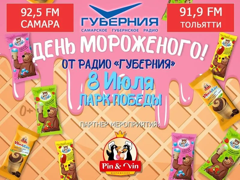 Горожан и гостей Самары 8 июля ждёт настоящее торжество мороженого. В этот летний день радио "ГУБЕРНИЯ" планирует освежить своих слушателей необычным способом. Каждый пришедший в парк Победы получит охлаждающее лакомство от партнера нашей радиостанции - компании ПинВин. Помимо бесплатного угощения гостей праздника будут ждать конкурсы, призы и подарки, так любимый детьми аквагрим, танцевальная программа от ассоциации брейк-дансеров, а также музыкальное шоу от диджеев радио "ГУБЕРНИЯ", которые будут работать прямо здесь, на главной сцене парка. Присоединяйтесь к 3 млн наших потенциальных радиослушателей, включайте свои приемники на частоте 92,5 FM и приходите 8 июля в парк Победы к 17:00!
