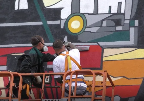 Для отрисовки мурала "Хлеб и сталь Победы" потребуется более 400 баллончиков с краской. Два центральных объекта композиции - девушка и паровоз. Подробнее смотрите в видео телеканала "Губерния" (12+).