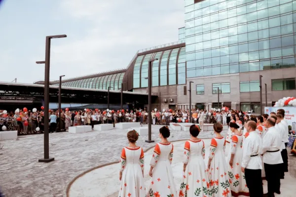 Гостей на вокзале встретил известный по всей России коллектив "Государственный Волжский русский народный хор имени П.М. Милославова", который был неоднократно номинирован и побеждал в многочисленных всероссийских премиях.