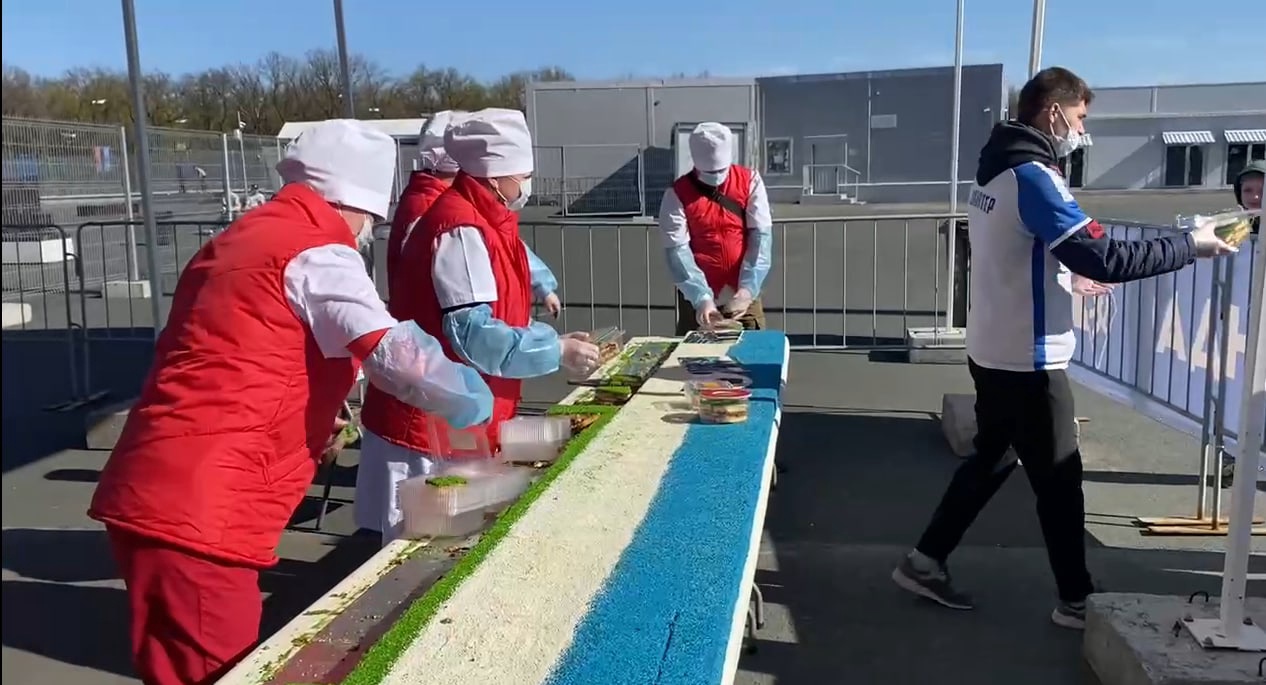 В раздаче торта участвуют волонтеры, которые разрезают его и упаковывают каждый кусочек в коробочку. Всего получится примерно 1000 порций. Доброволец Кристина Ильина делится впечатлениями: