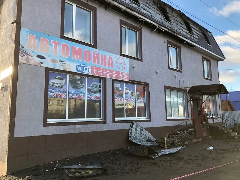 Кроме автомойки в трехэтажном строении предлагали услуги химчистки, здесь же стояли автоматы с напитками и снеками, кресла для посетителей. На том же земельном участке находится огромный "хозяйский" дом с зеленой крышей - стены его прилегали вплотную к гостинице.