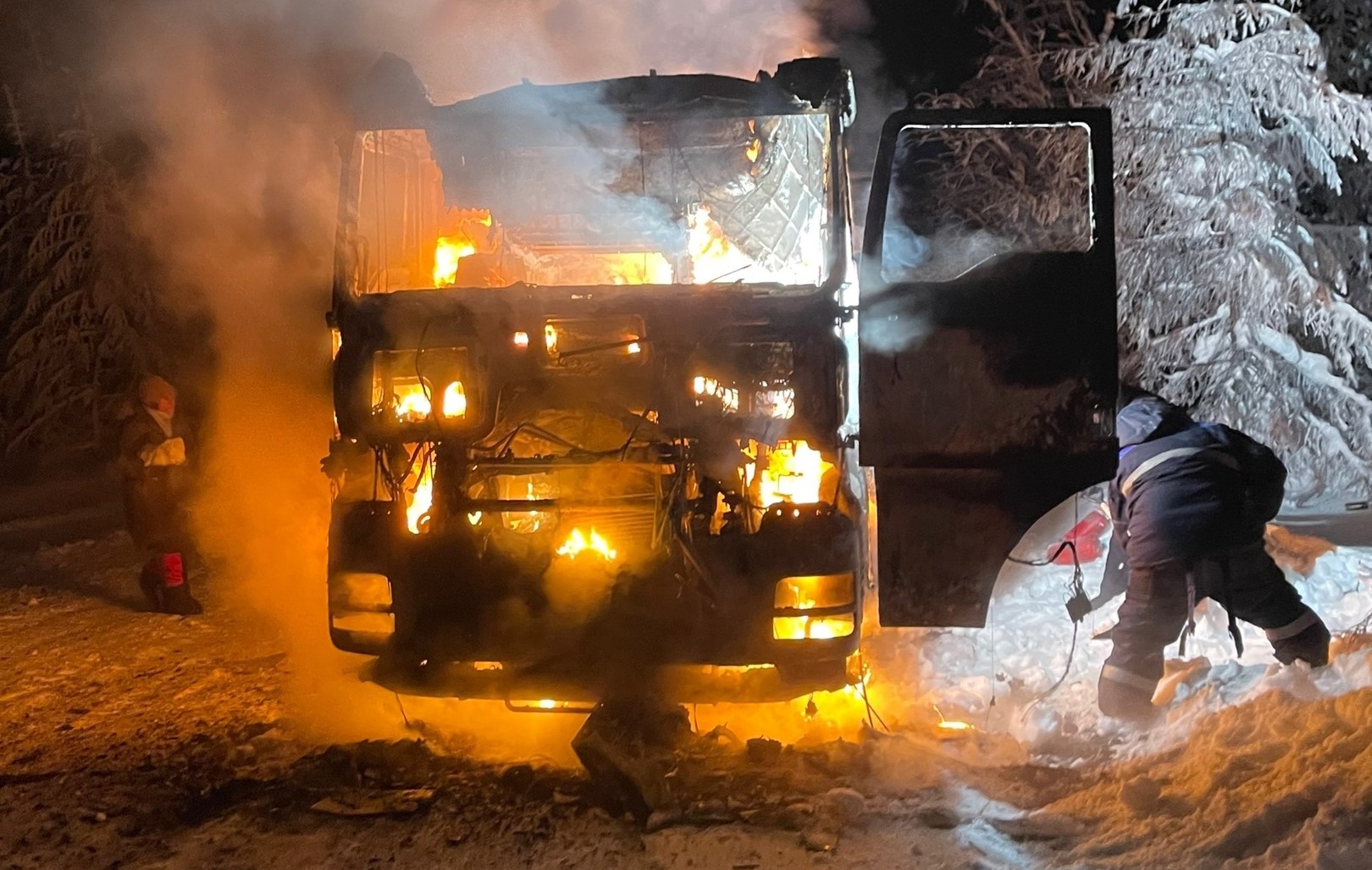 Выяснилось, что водитель работает дальнобойщиком. В своем большегрузе он вез бензин для отопления в поселок Оленек. Он рассказал путешественникам, что в его кабине заискрило, произошло короткое замыкание и он в последний момент успел выпрыгнуть из машины.