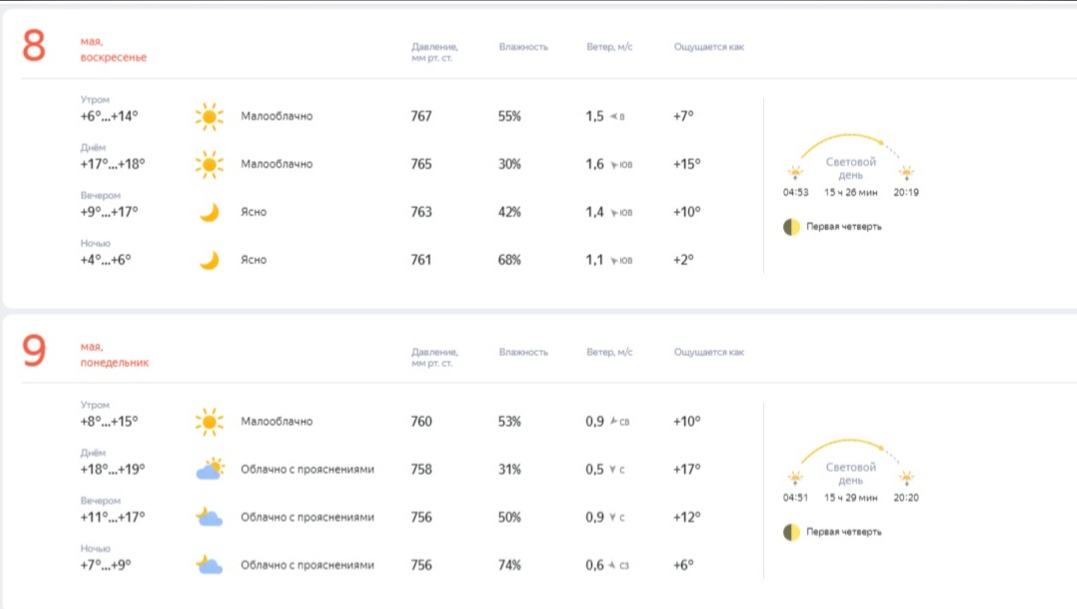 По данным Яндекс.Погоды, тепло и небольшая облачность продержатся до 12 мая.