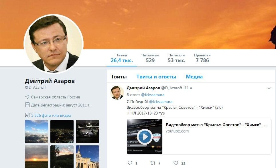 Глава региона опубликовал еще несколько твитов: поблагодарил за «радушный прием в сети» и написал, что 13 ноября начнется настройка «работы с вашими обращениями чиновников Правительства области», «Не сразу все получится, но этот путь мы с вами уже проходили 7 лет назад в городе. Областным чиновникам понравится быть ближе к людям», - отметил Дмитрий Азаров. Со своей страницы он также поздравил «Крылья Советов» с победой над подмосковными «Химками».