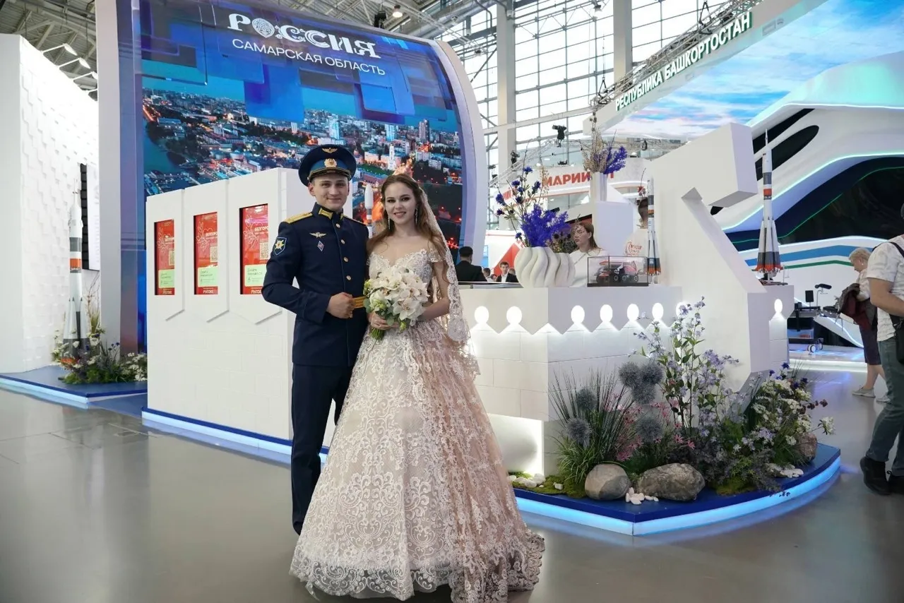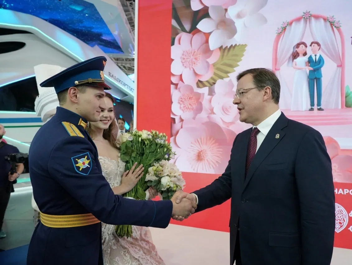 - Поздравляю вас. Вы - прекрасная пара. Очень надеюсь, что свою любовь вы пронесете через годы, через десятилетия, - обратился Дмитрий Азаров к молодоженам, которые после церемонии бракосочетания пришли на стенд родной Самарской области, где специально для них подготовили концертную программу.