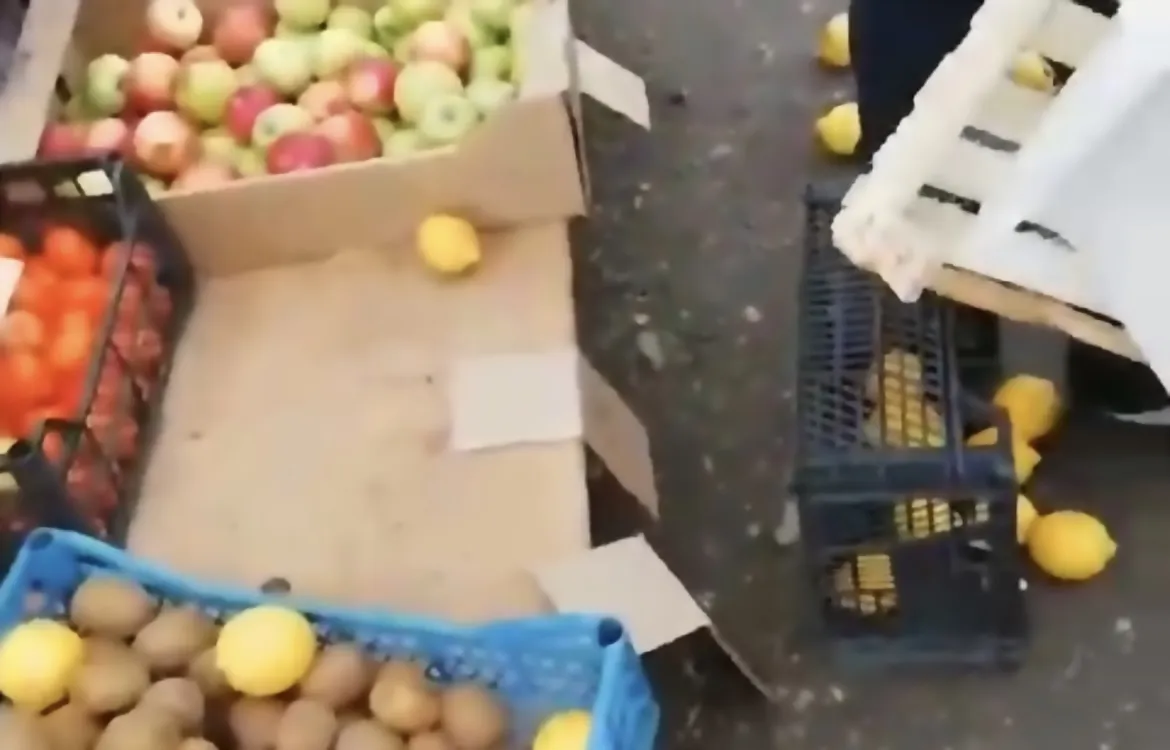 На видео на торговый прилавок набрасывается компания. Видимо, конкурентов что-то не устроило и они начали крушить все, что попадалось под руки. Летали поддоны, овощи и фрукты.