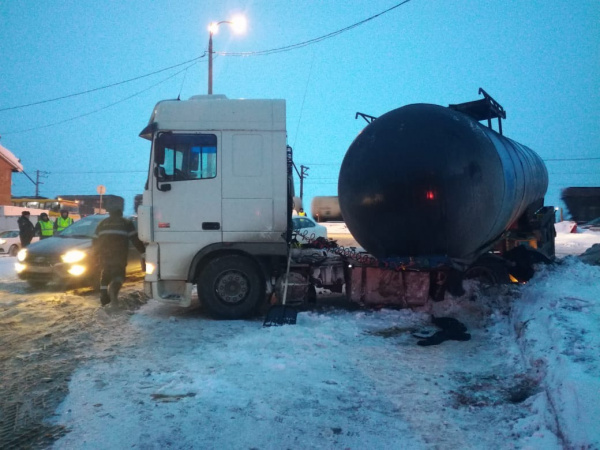 По предварительным данным, водитель DAF при повороте на улицу Куйбышева не справился с управлением. В настоящий момент трассу освободили для движения в обе стороны.