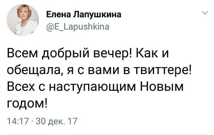 Накануне, 30 декабря, глава Самары Елена Лапушкина в своем аккаунте в «Твиттере» поздравила всех с наступающим Новым годом и заявила о готовности решать вопросы в том числе и посредством этой соцсети.