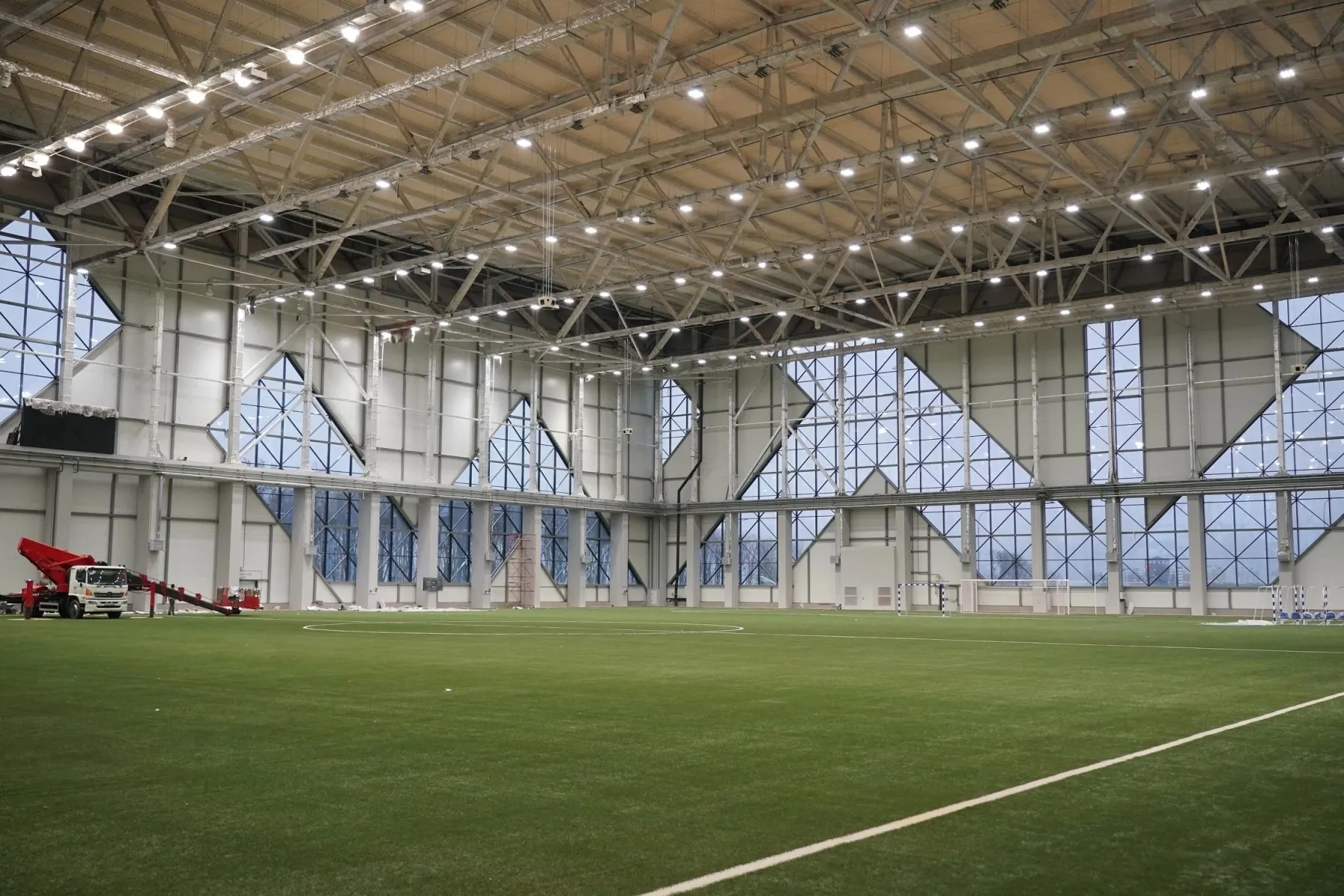 Как рассказали специалисты, манеж предназначен для круглогодичного использования. Размеры здания – 120х90 метров, высота 32 метра. Площадь самого футбольного поля - 100х73 метра, что соответствует стандартам УЕФА.