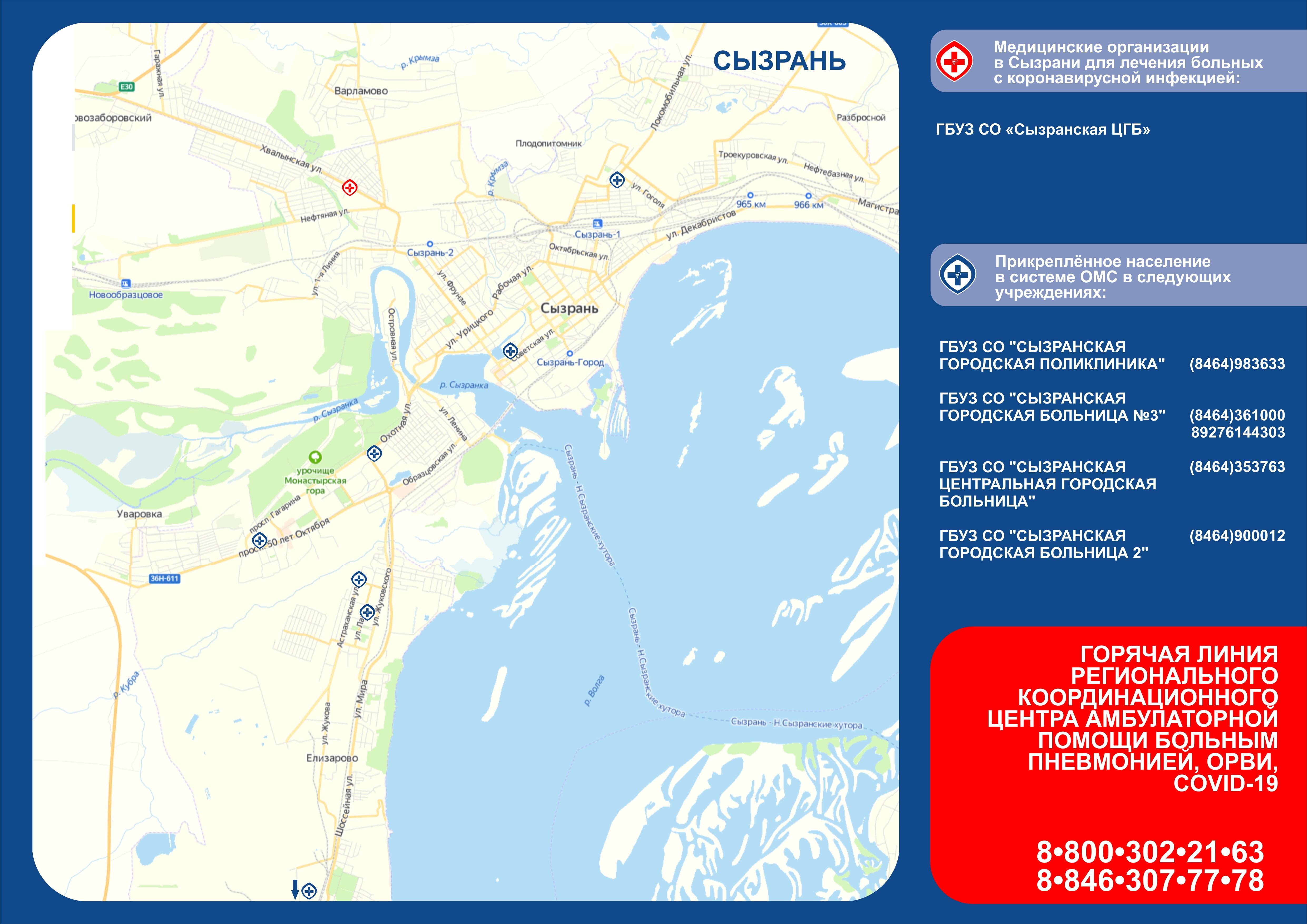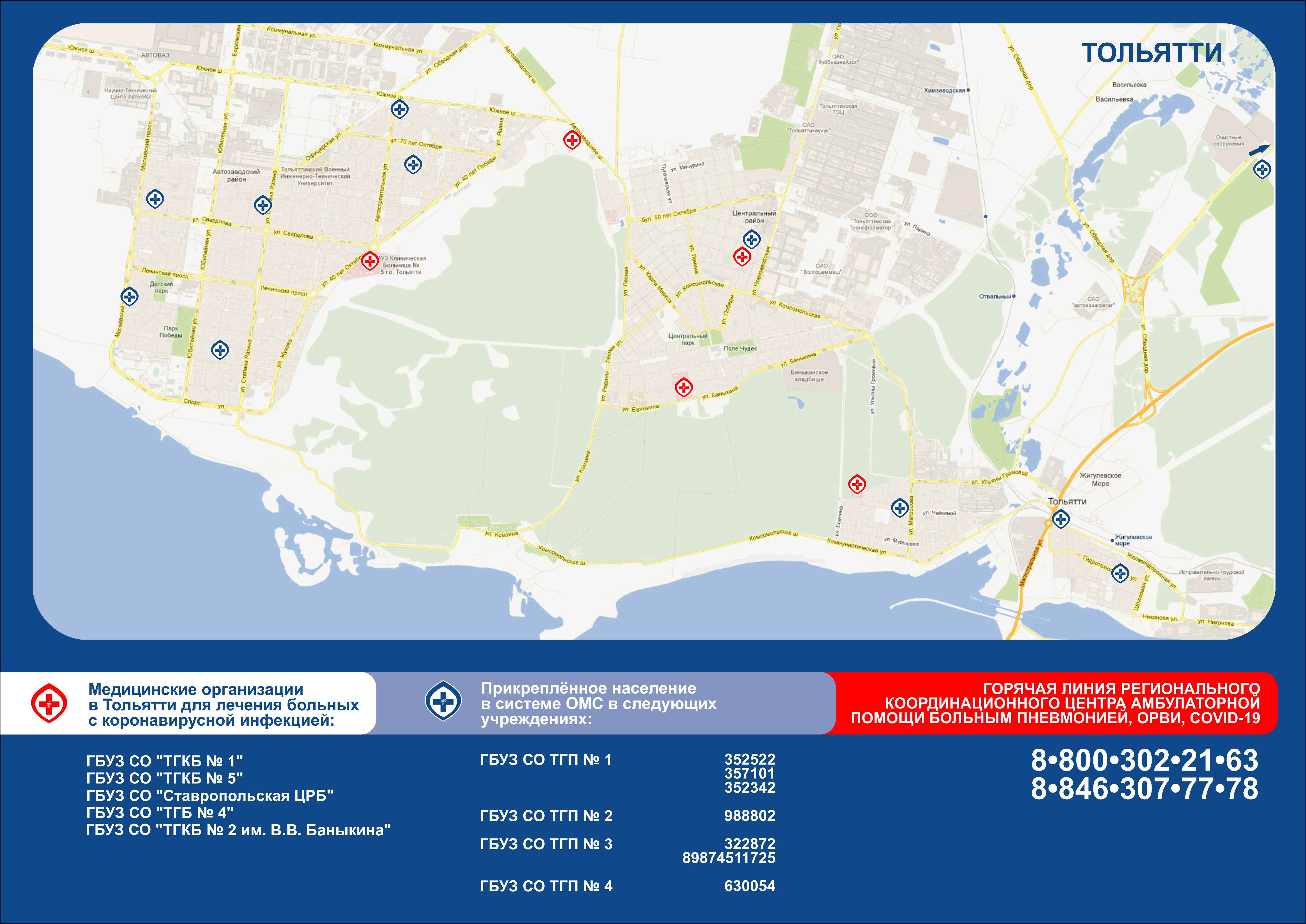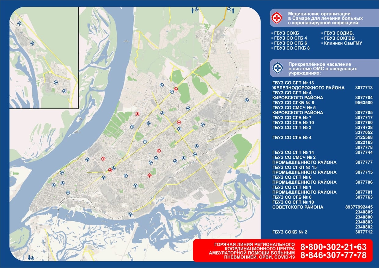 Минздрав Самарской области составил в помощь жителям информационные карты для обращения в медучреждения Самары, Тольятти и Сызрани. В них представлены адреса и телефоны больниц.