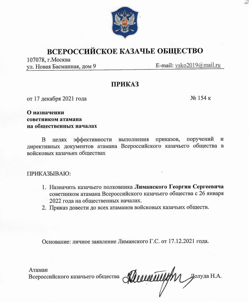 Георгий Лиманский станет советником атамана Всероссийского казачьего общества