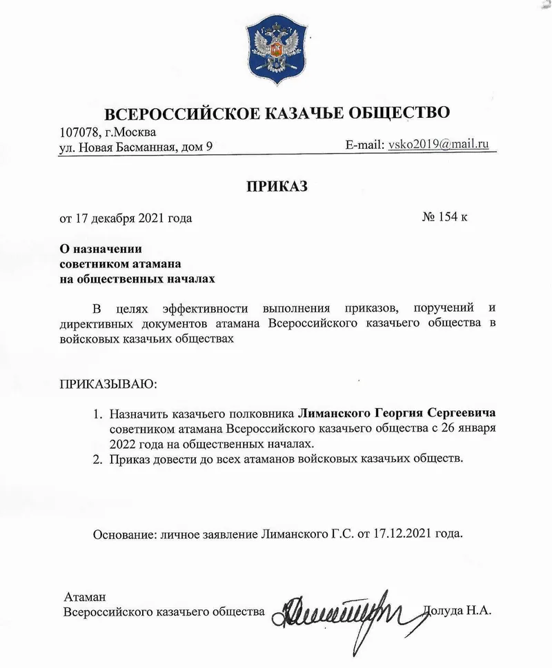 Как отмечается в документе, это делается "в целях эффективности выполнения приказов, поручений и директивных документов атамана ВсКО в войсковых казачьих обществах".
