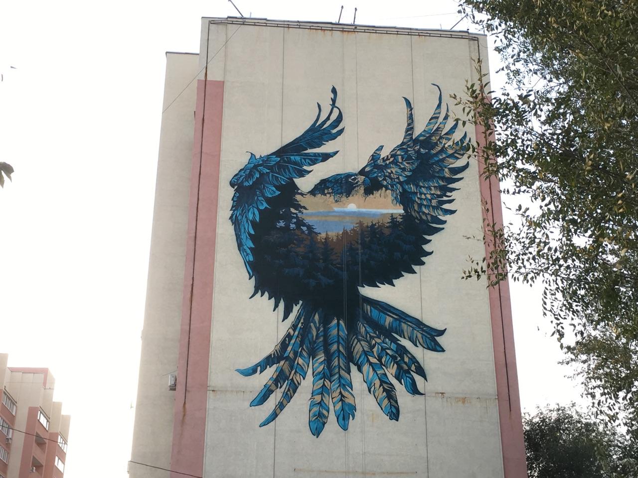 Первые наброски будущего граффити появились на доме № 2 по Казачьей вечером 2 октября. Сейчас основные работы над рисунком завершены. Темно-синяя птица будто обнимает Самарскую Луку. Волжский пейзаж с густым лесом разместили на груди орла. Изображение хорошо просматривается с улицы Шоссейной, которая в будущем будет принимать основной транспортный поток с Фрунзенского моста в направлении Кряжа.