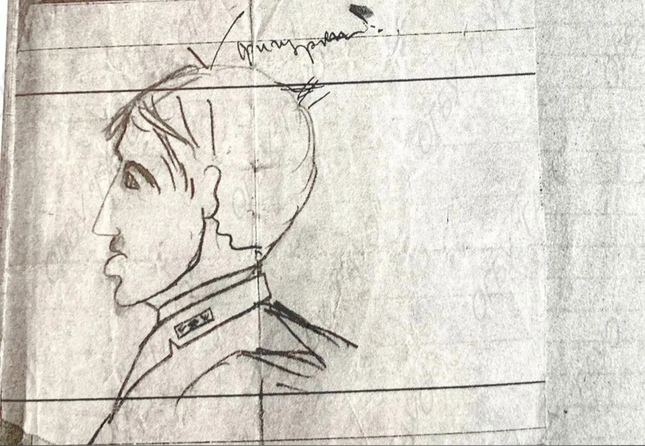 Наброски сделаны на небольших клочках бумаги. В углу красуется профиль какого-то преподавателя, а в углу надпись "передавай дальше". Видимо, записку пускали по рядам во время урока.