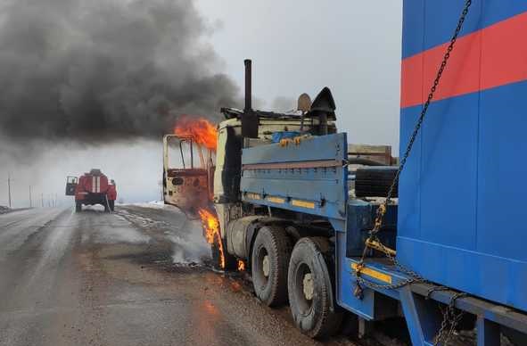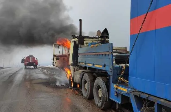 Сообщается, что в происшествии никто не пострадал. По предварительным данным, причина возгорания кроется в неисправности тягача.