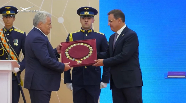 После того как Дмитрий Азаров принес торжественную присягу, председатель Самарской губернской думы Геннадий Котельников вручил ему Знак Губернатора.