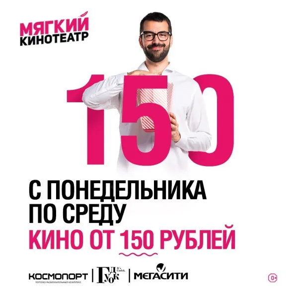 Для всех любителей кино, попкорна и 3D-очков "Мягкий кинотеатр" запускает акцию: любой сеанс по одной цене. Погрузиться в мир мирового и отечественного кино за комфортную сумму можно в "Мягких кинотеатрах", которые находятся в торговых центрах "Космопорт", "ГудОК" и "МегаСити".