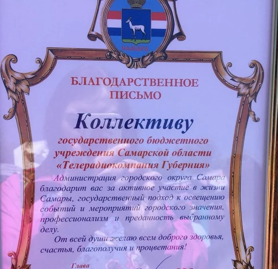 Благодарственное письмо телерадиокомпания "ГУБЕРНИЯ" получила от главы Самары.