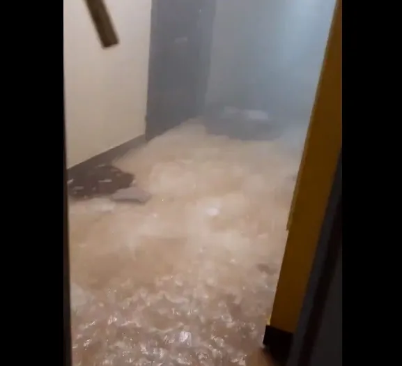 На видео, которое жильцы опубликовали в Твиттере, видно, что подъездный коридор полностью затопила горячая вода. Стекала она прямо с потолка. Отделка его настолько размокла, что кое-где отвалилась и рухнула на пол.