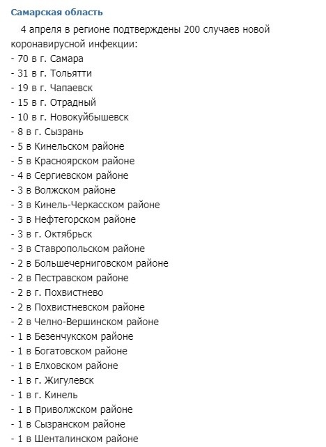 Больше всего вновь инфицированных - в Самаре (70), Тольятти (31) и Чапаевске (13). Меньше всего (по одному заражённому) - в 6 районах губернии, Жигулевске и Кинеле.