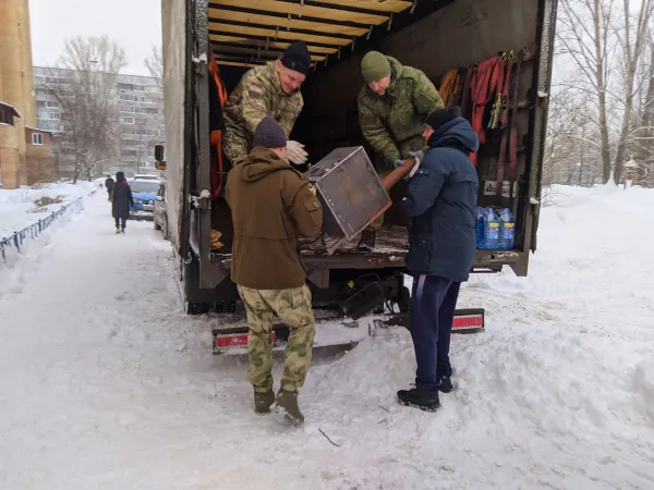Погрузку вели с пункта по сбору гуманитарной помощи союза десантников, расположенного в Автозаводском районе в доме по улице Жукова, 34. Волонтеры, десантники, общественники, депутаты выстроились в цепочку и передавали печки-буржуйки, коробки и пакеты во вместительный фургон. Прибежали сюда и дети, которые с горящими глазами помогали взрослым грузить легкую ношу.