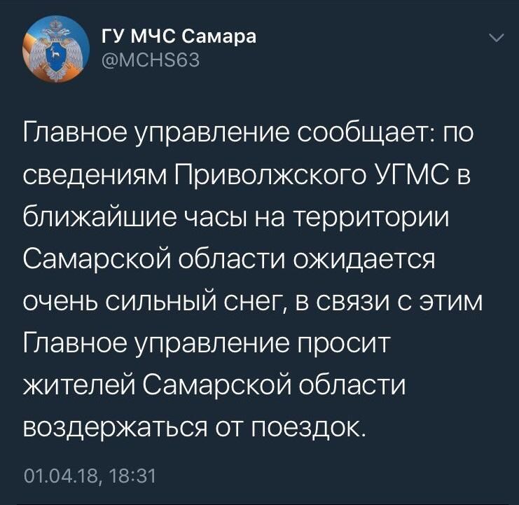 Как сообщает ФГБУ "Приволжское УГМС", до конца сегодняшнего дня по Самарской области местами все также ожидается сильный снег количеством 20 мм и больше. В связи с этим ГУ МЧС России по Самарской области, призывает жителей воздержаться от поездок.