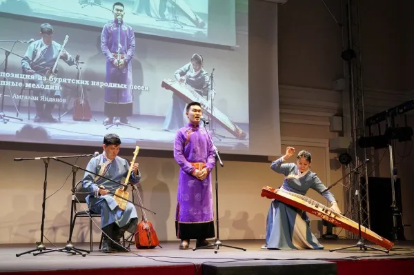 Участники бурятского ансамбля "Аялга" познакомили с особенностями культуры своего народа - традиционным пением и игрой на национальных инструментах. Одна из композиций называлась "Степные мелодии", и в ней чередовались протяжные и задорные бурятские мотивы.