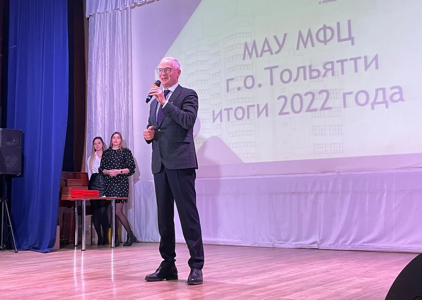 С приветственным словом к приглашенным обратился глава городского округа Тольятти Николай Альфредович Ренц. Он отметил важность работы учреждения для всех жителей города и сказал, что ценит профессионализм всего коллектива МАУ "МФЦ". Николай Альфредович вручил почетную грамоту администрации г. о. Тольятти за добросовестный труд, высокий профессионализм, большой личный вклад в организацию работы многофункционального центра предоставления государственных и муниципальных услуг в г. о. Тольятти и в связи с победой МАУ "МФЦ" в региональном конкурсе "Лучший МФЦ Самарской области" 2022 года в номинации "Лучший проект" (программа для ЭВМ "Управление выездным сервисом") директору МАУ "МФЦ" Елене Владимировне Росляковой. Также Николай Ренц наградил сотрудников Благодарностями главы г. о. Тольятти.