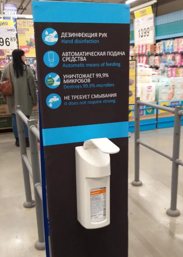 Сегодня, 13 марта, в соцсетях появилась запись жителя Тольятти, который сообщил о том, что в супермаркетах появились мобильные стойки с дезинфицирующим средством. Как указано на стенде, вещество способно удалить 99,9 % микробов и не требует смывания. Оно предназначено для обработки ручек тележек и рук покупателей. Причём ничего нажимать не надо: средство подаётся автоматически. Тольяттинец заметил, что это очень нужная вещь в период обострения вирусных заболеваний.