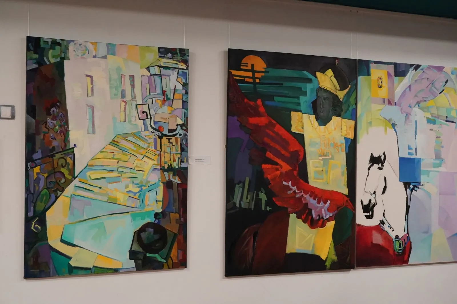 В картинах Дмитрия Краснова действительно много света, преломленного через воображение художника, и яркий колорит. Желтые, зеленые, синие, фиолетовые геометрические фигуры составляют единое целое с изображением реальных предметов, людей, животных. В этих картинах есть тайна, недосказанность. Смысл их образов можно долго разгадывать. Пример – картина "Книга", где можно увидеть черно-белый силуэт коня и необычный образ (видимо, архангела) со старославянскими буквами на желтой рубахе. Рядом – нечто, напоминающее багровое крыло, оранжевая луна, выглядывающая из-за тучи, и прочие загадочные подробности. Картина "Переправа" вызывает ассоциации с образом Харона из древнегреческих мифов. А работа "На закате солнца" с красным быком, помещенным в желтое пространство, - с корридой. Полны загадок и недосказанности картины "Праздник Победы", "Рассвет на Волге", "Древний город".