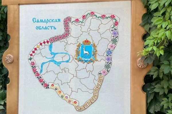 Концепция вышитой карты Самарской области базируется на традиционной народной художественной культуре народов, исторически проживающих на территории губернии. Изделие представляет собой текстильное расшитое панно в деревянной рамке, стилизованной под традиционный оконный наличник самарской домовой резьбы.