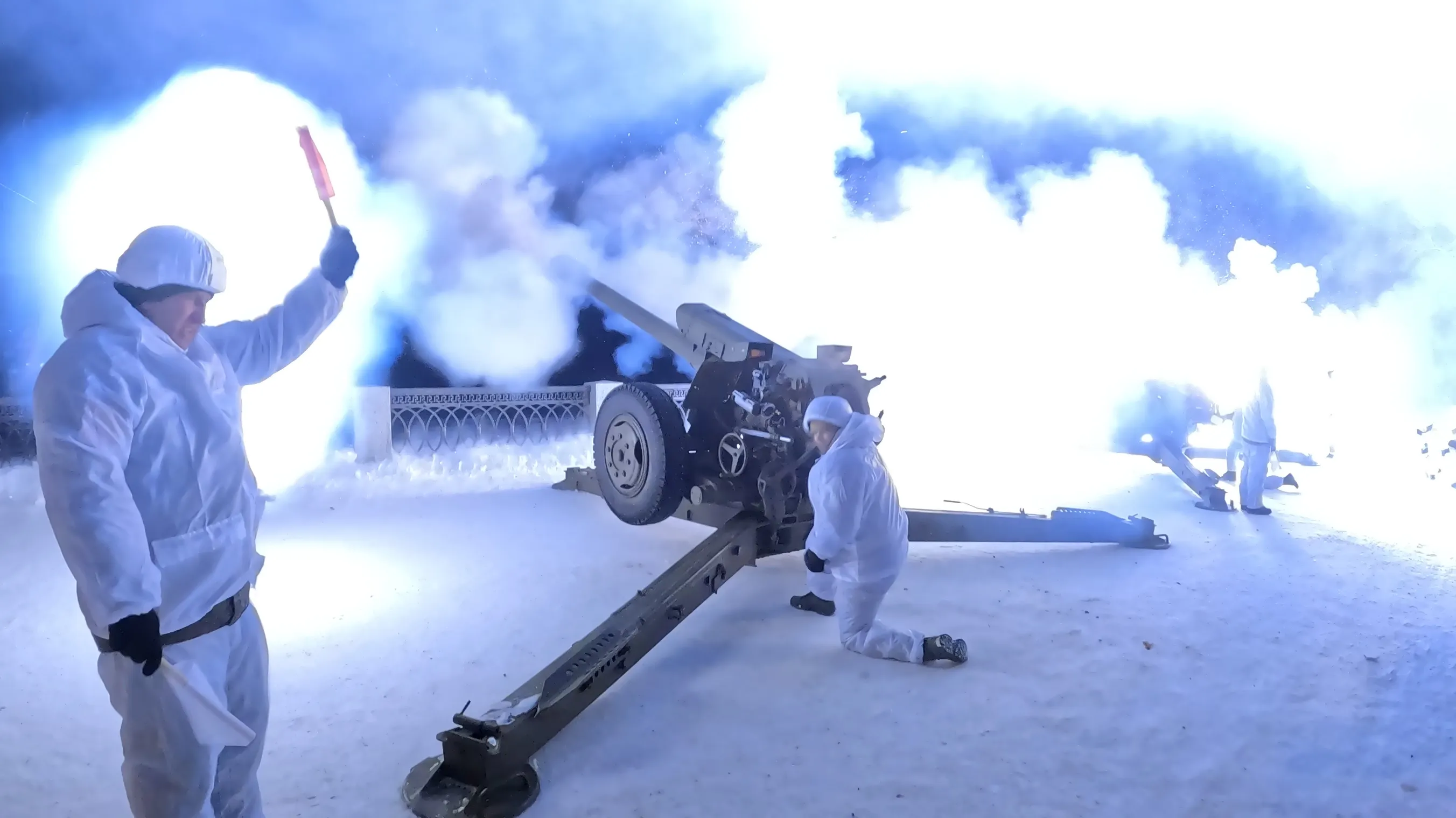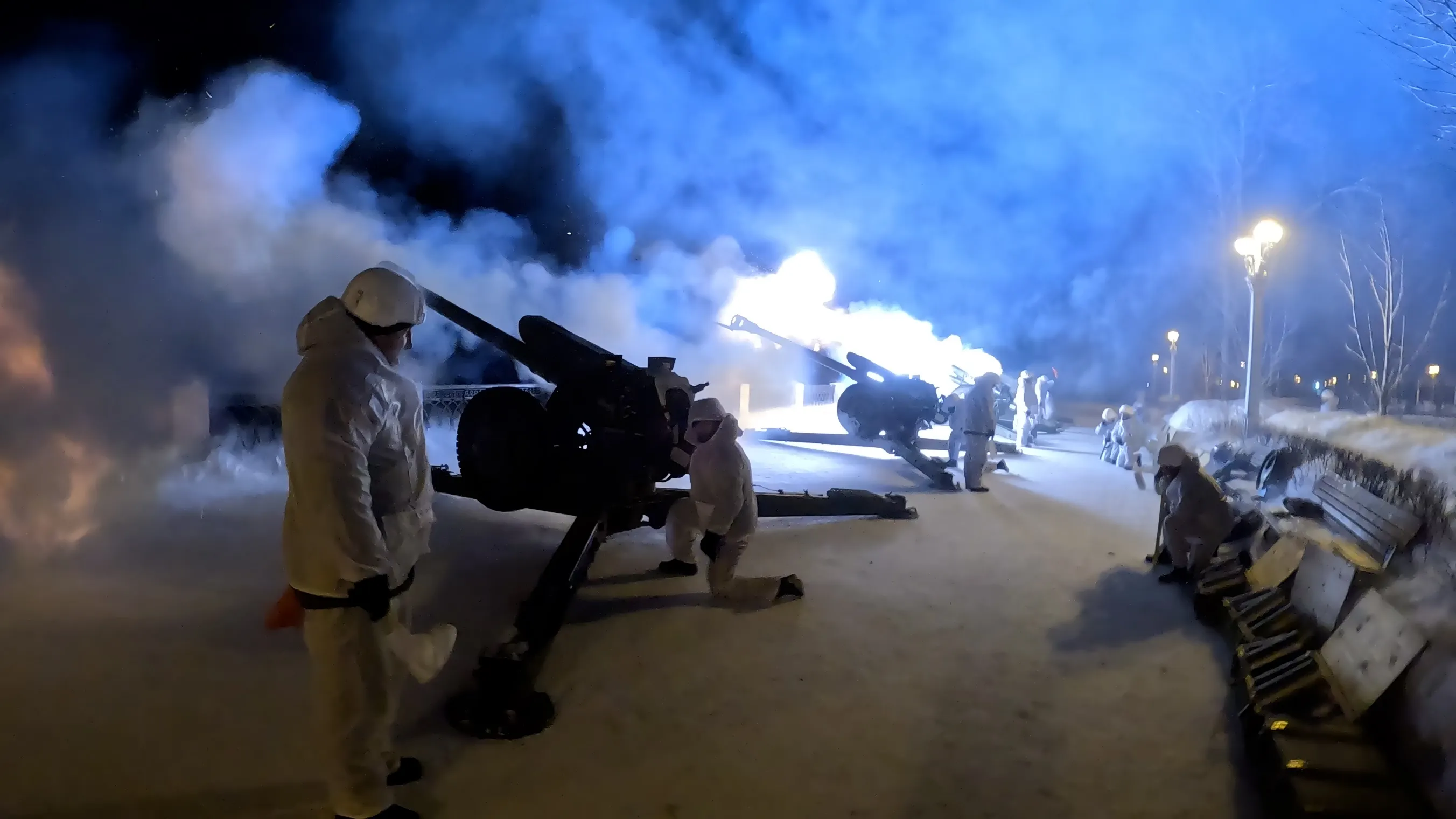 Артиллеристы общевойсковой армии Центрального военного округа расположили салютные установки на "старой" части набережной Волги. Зрители могли наблюдать представление как стоя на берегу, так и на прогулочной части улицы.