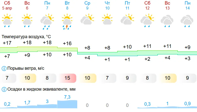 По данным сервиса Gismeteo, с 5 по 8 апреля в Самаре ожидаются дожди. А во вторник, 8-го числа, может быть еще и гроза.