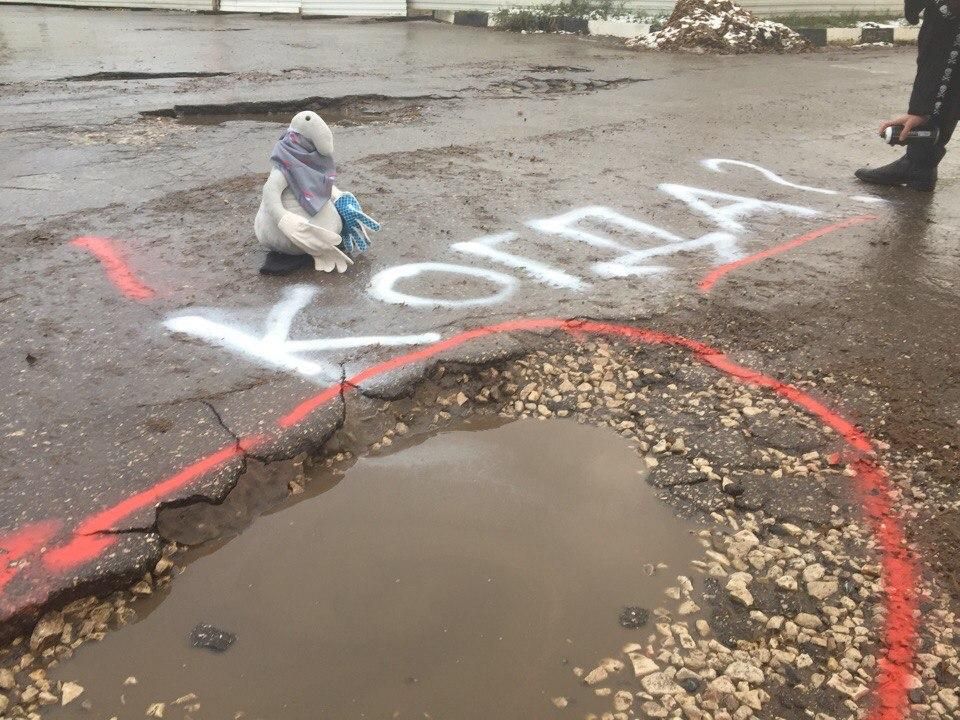 В Самаре на улице Ново-Вокзальной прошла акция "Яма, засветись". Активисты ОНФ удивили жителей креативным отношением к плохим дорогам. Около одной из ям посадили популярного интернет-персонажа - Ждуна и надели на него строительные перчатки. Таким образом активисты надеются привлечь внимание к очевидным проблемам городских дорог.