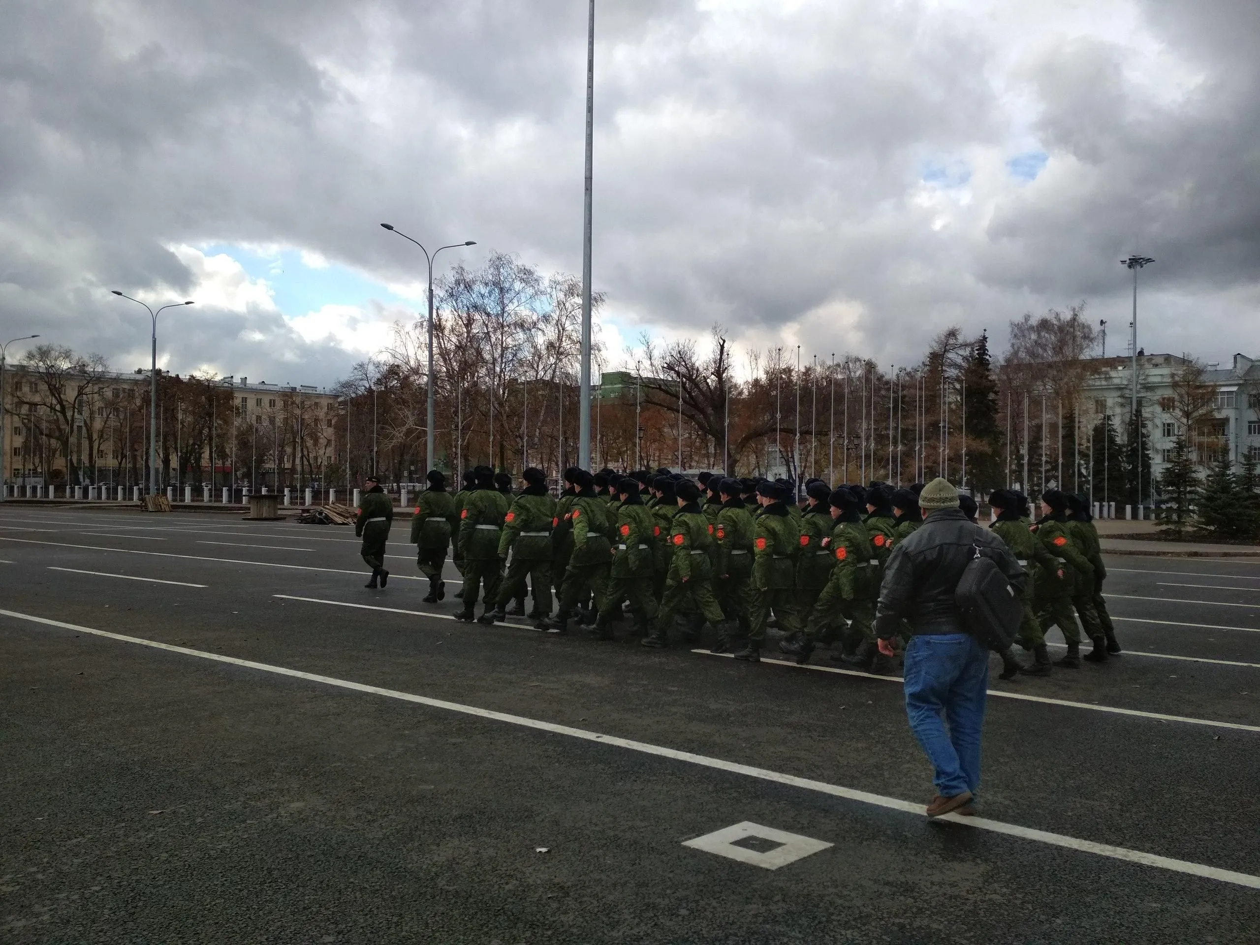 Задача этой мини-репетиции - определить место построения каждого парадного расчета на площади. Пока строевой шаг все участники парада отрабатывают по отдельности. Генеральная репетиция с построением всех "коробок" и знаменных групп пройдет 6 ноября в 16:00.